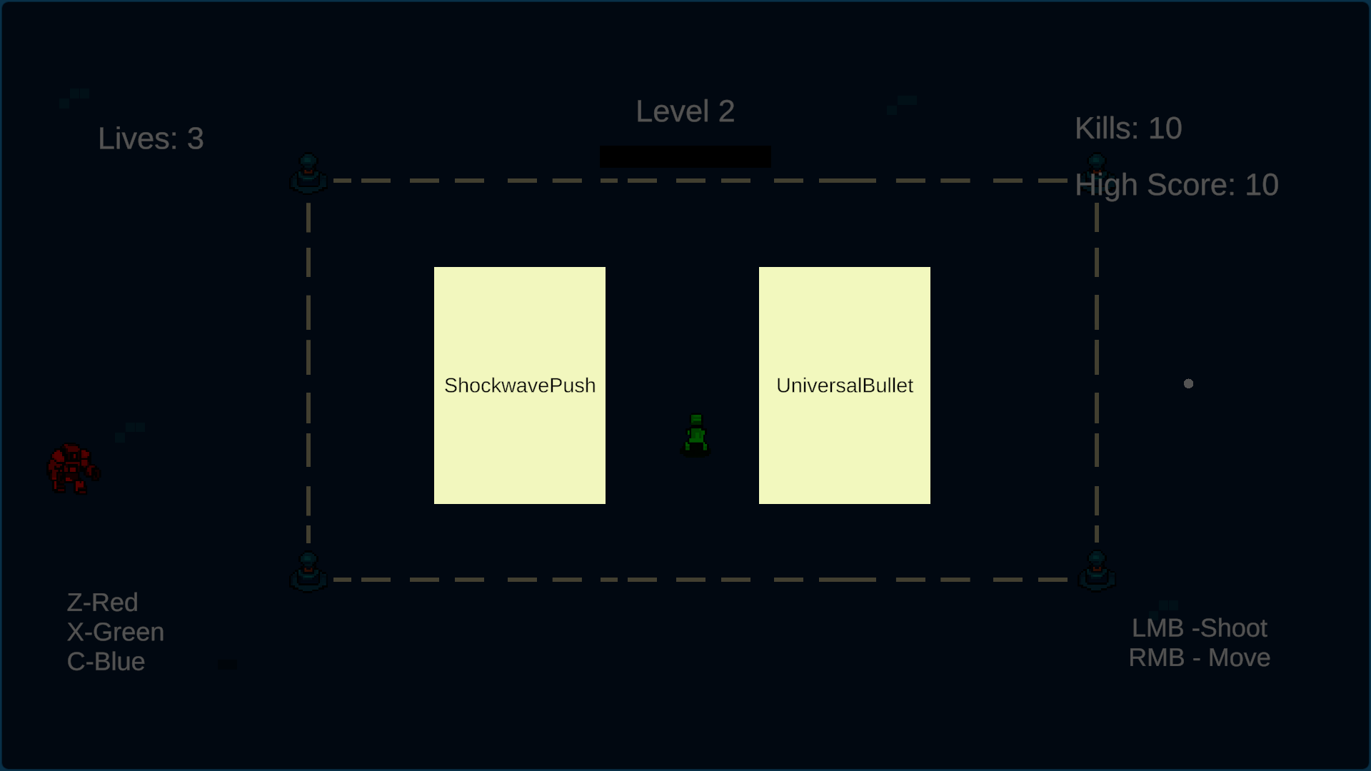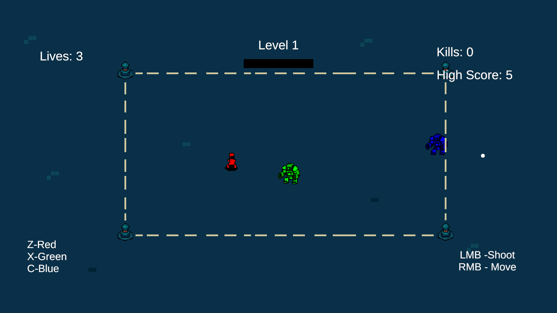 Use Left Mouse Button to shoot, Right Mouse Button to change direction, and Z / X / C to shift bullet colors in real time. Each enemy can only be destroyed by the correct color, forcing constant adaptation under pressure.